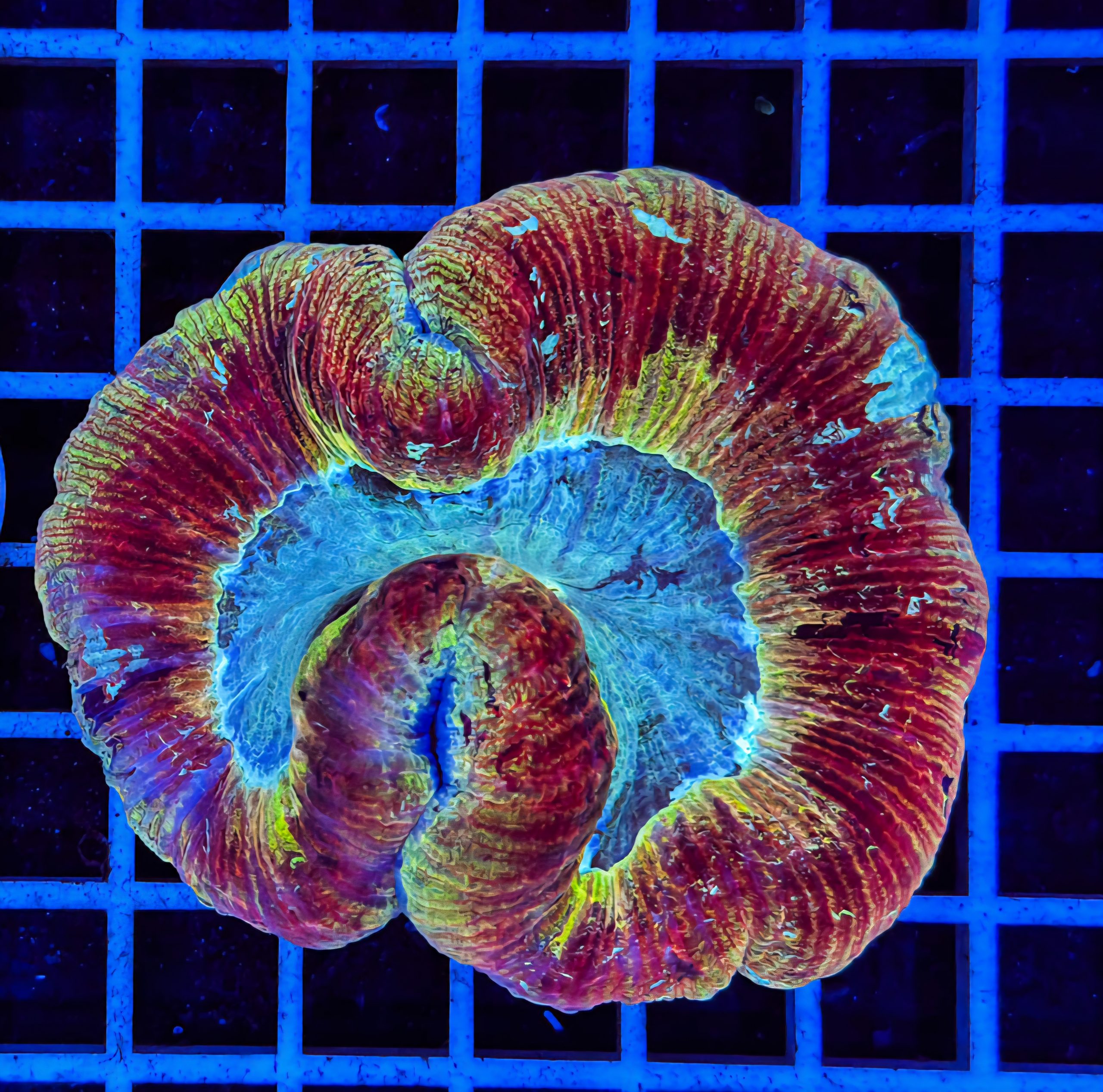 Trachyphyllia Geoffroyi Multicolor ist eine großpolypige Steinkoralle (LPS = kurzform für Large Polyp Scerlactinia) Trachyphyllias kommen vor allem in Innenriffbereichen, Lagunen und auf den Weichböden vor.